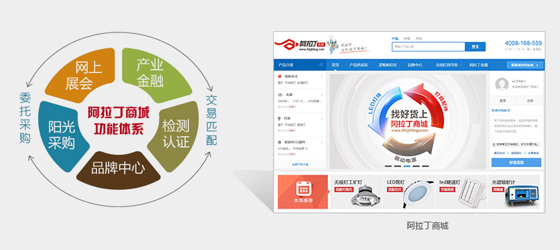 阿拉丁商城專注照明垂直產(chǎn)業(yè)鏈產(chǎn)供銷整合,提供供應(yīng)鏈集中采購、貿(mào)易撮合、委托采購、線上線下產(chǎn)品體驗與交易、渠道管理、垂直媒體運營、品牌推廣、產(chǎn)業(yè)鏈金融等互聯(lián)網(wǎng)與移動互聯(lián)網(wǎng)綜合解決方案。同時,致力整合、提升傳統(tǒng)產(chǎn)業(yè),構(gòu)筑“互聯(lián)網(wǎng)+行業(yè)會展”、”互聯(lián)網(wǎng)+產(chǎn)業(yè)鏈”“互聯(lián)網(wǎng)+線下”的創(chuàng)新B2N模式。